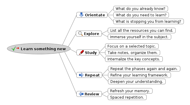 The following simple process starts with analyzing your current situation. By exploring your subject you get to know what there is to learn, and from there you can choose a specific topic to focus on. Repeting these phases again and again takes you dig deeper into the subject. In addition to these intensive phases, additional reviews strengthen your understanding and memory.
